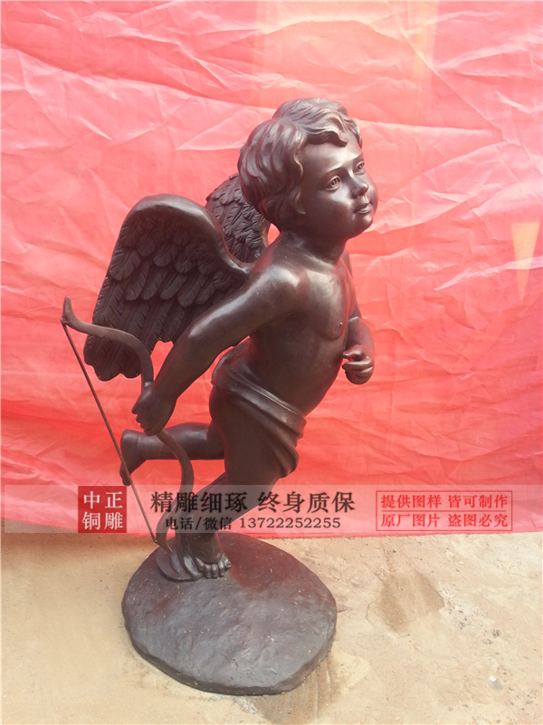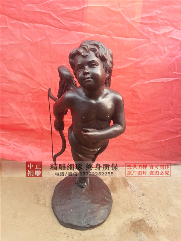丘比特,在希臘神話中他的名字是厄羅斯,他是維納斯的兒子,他的箭筒里裝著金箭與鉛箭,傳說中,天上天下男男女女,一旦被他的金箭射中就將墮入愛河,但要是被鉛箭射中就會(huì)對(duì)眼前人心生憎惡,因此丘比特銅雕塑被塑造成了一個(gè)總是扇著翅膀亂飛、亂射箭的光屁股小孩。