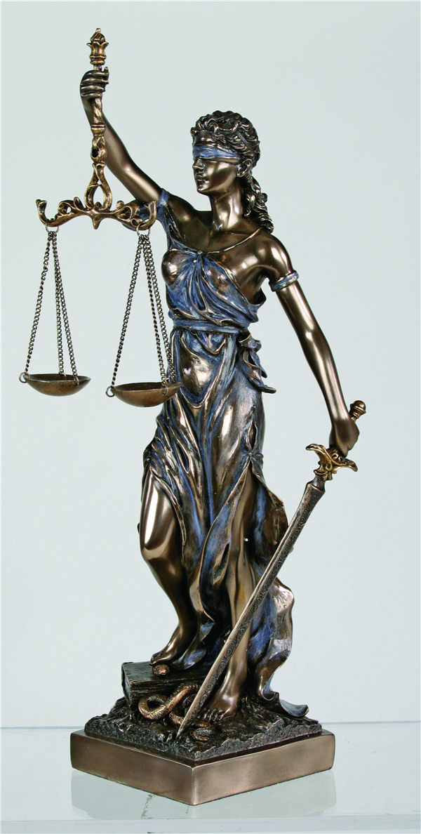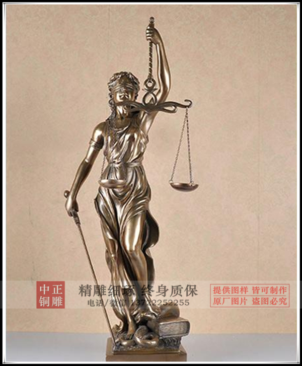 根據(jù)古希臘傳說:天庭上的眾神之間出現(xiàn)了矛盾和沖突,世界因此處于災(zāi)難的邊緣。由誰來裁判眾神之間的矛盾?血氣方剛的容易受到水仙女的引誘,老于世故的卻不敢仗義執(zhí)言,天上地下找遍了,最終也沒有找到合適的人選。最后,天帝身旁站起一位白袍金冠的女神,拿出一條手巾,蒙在自己眼睛上,說:我來!眾神一看,不得不點頭同意:她既然蒙住了雙眼,看不見爭紛者的面貌身份,也就不會受到誘惑和威脅。