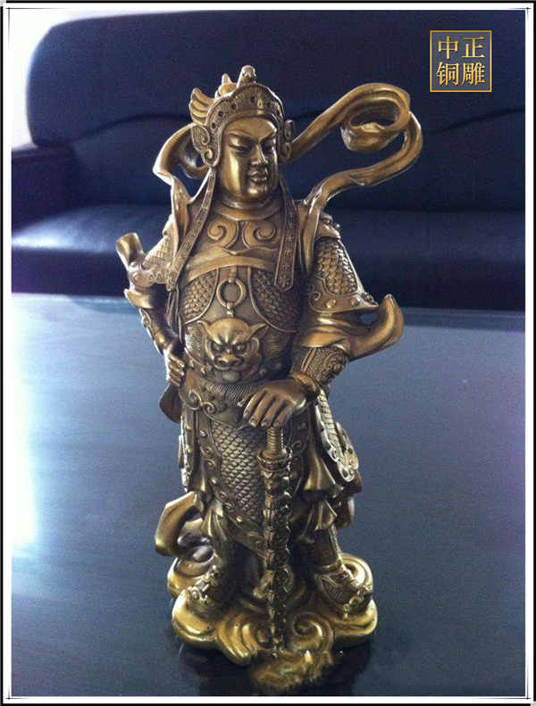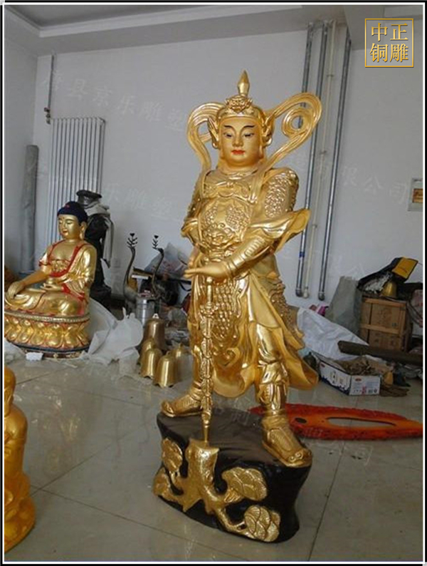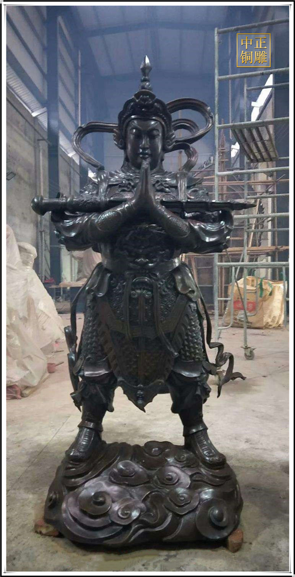 于是,韋陀被人們稱為護法菩薩。在中國的寺院殿宇里原印度血統的銅雕佛像韋陀已經漢化了,成了一名地道的中國武將,英俊威武。他身披鎧甲,手持金剛杵,降魔去妖,威風凜凜。天王殿中所塑的韋陀,一般具有兩種站立的姿態,一個是雙手合十,橫杵于腕上,直挺而立;一個是一手握杵拄地,另一手叉腰。