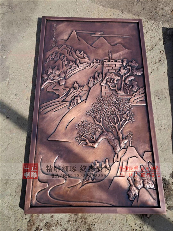 銅浮雕又是中國古文化藝術,在引進歐洲先進工藝和先進技術,經過長期攻關和研究在國內首家研制開發生產的高級紫銅工藝品,以不脫色、不銹蝕的優質紫銅為原料,經過多道工序精制而成,在形式上和內容上與地方特色文化緊密結合,具有立體感強、風格古樸、做工精細、形象逼真、畫面栩栩如生、可永久收藏等特點。中正銅雕-風水山水畫浮雕,加工風水山水畫浮雕,定做風水山水畫浮雕,我廠是自產自銷,中間無需過手,價格合理,承接貴單位來樣定制,并幫助設計策劃圖案,歡迎各大新老客戶前來咨詢、選購!