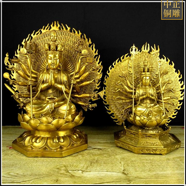 觀音的化身有很多,而千手觀音就是其中之一,而且還受到人們的虔誠供奉,但不知道大家是否了解千手觀音的來歷呢,“千”為無量及圓滿之義,以“千手”表示大慈悲的無量廣大,以“千眼”代表智慧的圓滿無礙。千手千眼觀世音能利益安樂一切眾生,隨眾生之機。中正銅雕-純銅千手觀音像、純銅千手觀音像價格、純銅千手觀音像廠家,我司是一家資質(zhì)齊全、設(shè)備完整、實力雄厚的私營企業(yè),集科研、開發(fā)設(shè)計、普通鑄造、一次性整體澆鑄、精密鑄造于一體。主要鑄造大型現(xiàn)代人物銅雕,抽象人物銅雕,抽象人物銅雕,歷史人物銅雕,動物銅雕,園林景觀銅雕等。
